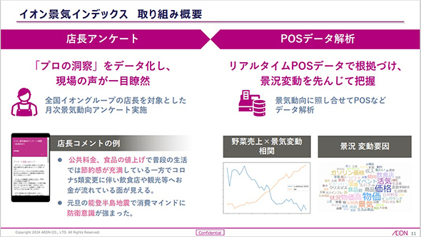 一方、イオン景気インデックスは、グループ全体の売上実績データと日常の買い物の第一線に立つ店長たちの気付きを照らし合わせて地域別および業態別の景気動向を「見える化」するのが目的だ。この取り組みの背景について中山氏は、「既存の景気指標はタイムラグがあり、現場業務に生かしにくい。また、消費者の生活実感と乖離(かいり)しているとの声もあるなど、実用化に向けた課題があった。こうした中で、タイムリーに日々の景況感を分かりやすく反映することが求められている」と説明した。