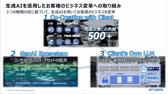 - GenAI Ecosystem: 生成AIはすでにさまざまなベンダーから多様な種類の生成AIが提供されているので、それらをNTTデータのプラットフォームからも提供できるように連携を進め、当社のコンサルティングなどを通じて顧客にとって最適なソリューション提供するといった生成AIにおけるパートナーエコシステムの構築だ