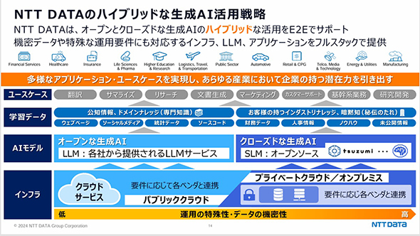 本橋氏は上記3つの取り組みを挙げた上で、同社の生成AI活用戦略を語った。それによると、パブリックとプライベートの使い方があるクラウドと同様に、LLM(大規模言語モデル)による「オープンな生成AI」とSLM(小規模言語モデル)による「クローズドな生成AI」をフレキシブルにハイブリッド利用したいというニーズに応える構えだという(図8)。