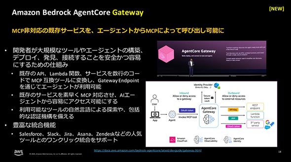 Amazon Bedrock AgentCoreの要素の1つで、「Amazon Bedrock AgentCore Gateway」と呼ぶサービスだ。これにより、MCP(Model Context Protocol)に非対応の既存サービスを、エージェントからMCPによって呼び出せるようになるという。小林氏によると、「開発者が大規模なツールやエージェントの構築、デプロイ、発見、持続することを安全かつ容易にするための仕組み」とのことだ。(図3)