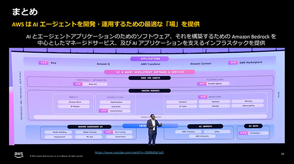 小林氏は説明の最後に、「AWSはAIエージェントを開発、運用するための最適な『場』を提供する」とし、具体的に「AIとエージェントアプリケーションのためのソフトウェア、それを構築するためのAmazon Bedrockを中心としたマネージドサービス、およびAIアプリケーションを支えるインフラスタックを提供する」と説明した。(図4)
