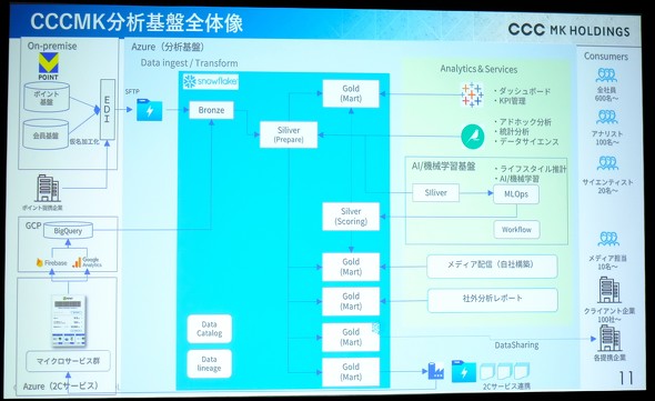 現在の分析基盤は、ポイントデータやアライアンス企業からのデータを「Snowflake」に集約し、メダリオンアーキテクチャ(※)でデータマートを整備したものだ。データアナリストやデータサイエンティストを含む600人を超える従業員が、ダッシュボードやKPI管理、アドホック分析、AI/機械学習などの用途で活用している。