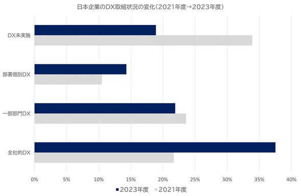 実際に、COVID-19の影響により、50%の企業がDX推進が「加速」したと回答している。IPA(情報処理推進機構)の調査では、DXに取り組む企業の割合が2021年度の55.8%から2023年度には73.7%まで増加した。この現象は、単なる流行ではなく、「労働需給ギャップが臨界点を超えること」「消費者のデジタルに対する価値観の変容」といった2つの大きな波に飲み込まれないための、企業の存続をかけたムーブメントだと捉えている。