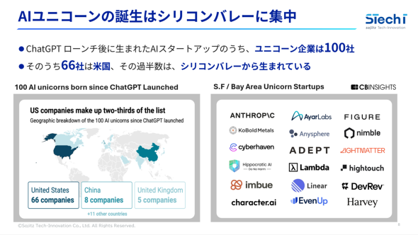 セッションの冒頭、モデレーターを務める双日テックイノベーションの榎本瑞樹氏(ブランドマーケティング推進室長)がAI分野の投資トレンドを紹介した。世界における2024年のAIスタートアップ投資は1004億ドル(約15兆円)で過去最高を記録。「ChatGPT」の登場以降に誕生したAIユニコーン(評価額1500億円以上で事業として成立している企業)は約100社に達し、その内66社は米国、さらにその過半数(38社)がシリコンバレーに集中している。