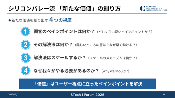 シリコンバレー流の「新たな価値の作り方」には4つの要素がある。第1に顧客のペインポイントが何かを見定め、その深度を測定すること。ペインポイントとは顧客の困りごとや課題を指す。身近な例として、高齢者の移動の困難さなどが挙げられる。実生活での具体的な困難を把握することが、真のペインポイント理解につながる。