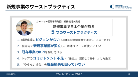 第1に新規事業のビジョン不在。スローガン的な掲げ方ではなく、高解像度の目標が必要だ。第2に組織内での孤立。主力事業から新規事業にリソースが充分に分け与えられず、“出島”が“孤島”化するケースは多いという。第3に既存事業KPIの押し付け。第4にトップのコミットメント不足。第5に機会損失の測定不足。新規事業がうまくいかなかった場合は厳しく評価される一方で、やらなかった場合のディスラプション被害は測定されない。この非対称性が日本産業の衰退を招いてきたという指摘は重い。
