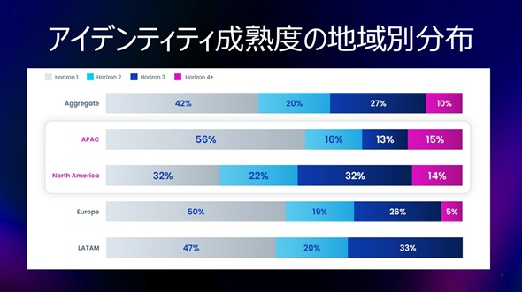 同レポートによれば、アジア太平洋地域では56%の企業がホライゾン1にとどまっており、これは北米(32%)や欧州(50%)と比較して高い割合である。日本も同様の傾向にある可能性は高い。この背景には、多くの日本企業の経営層が、依然としてマルウェア対策やファイアウォールといった「境界線防御」をセキュリティ対策の中心と捉え、アイデンティティーの重要性への理解が追い付いていないという根深い課題があるのではないかとゴセット氏は述べる。