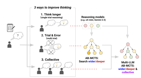 「長く考える」「何度も考える」を組み合わせたAB-MCTS。Sakana AIはさらに「複数人で考える」を組み合わせた「Multi-LLM AB-MCTS」も開発した(出典:Sakana AIのWebサイト)