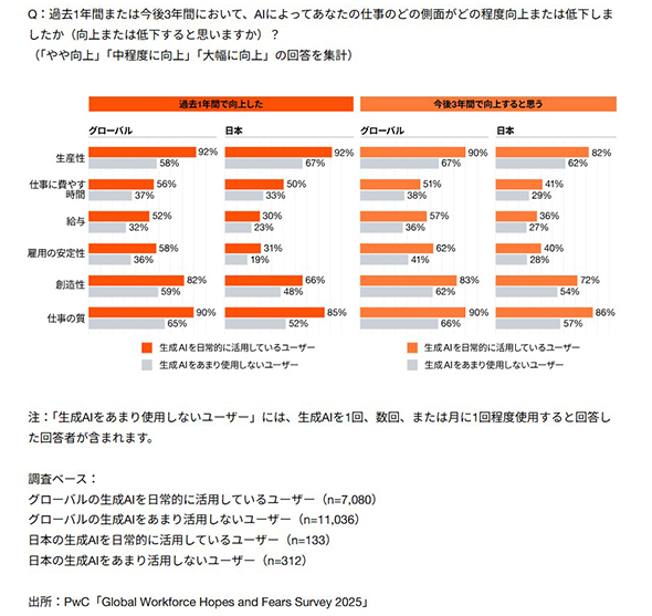 まず生成AIから見ていこう。グローバルでは業務で生成AIを日常的に活用している人は、活用頻度の低い人と比べて、この1年間で生産性や雇用の安定性、給与のいずれにおいても「向上を実感している」と答える割合が高かった。