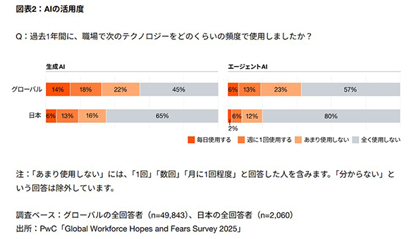 PwC Japanグループ(以下、PwC)が発表した「グローバル従業員意識/職場環境調査 「希望と不安」2025:仕事の未来を再構築する」(注1)は、単なるツールの利用状況ではなく、従業員の意欲を高め、組織の成長を実現するために必要な組織風土の実態に迫っている。
