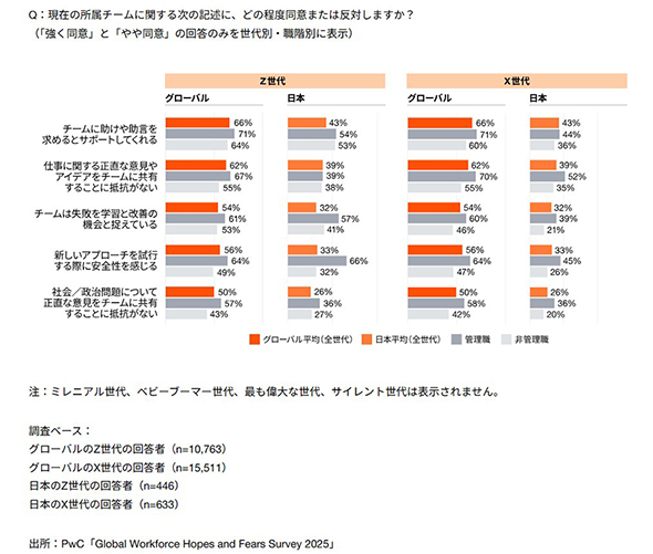 PwCによると、AIの進化と価値観の変化が大きい中で企業変革を推進するには、心理的安全性(チーム内でリスクを取ることへの恐れを感じない状態)の確保が欠かせない。しかし、職場の実態は程遠い状況にあるようだ。
