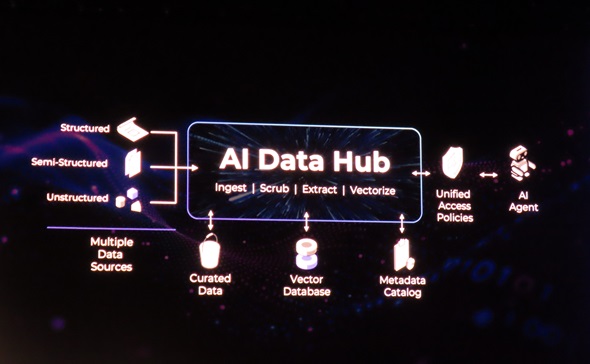 これらが既存の競合とすれば、ワンプラットフォーム、ワンエクスペリエンス戦略の下で進むプラットフォーム戦略で競合も拡大するのか。例えば、2日目の基調講演では、RAGのためのデータの統合として、データベース/ファイル、オブジェクト/アプリケーションデータと複数のソースをまたいだデータのパイプラインと結合をする”AI Data Hub”のデモを見せた。