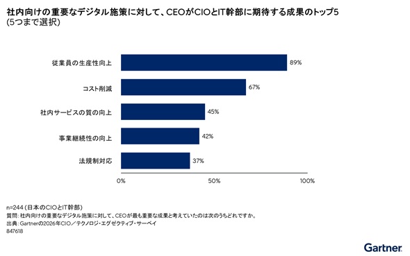 同社が2025年に実施した「2026年CIO/テクノロジー・エグゼクティブ・サーベイ」によると、日本企業のCEOが社内デジタル施策で最高情報責任者(CIO)やIT幹部に求める成果として最も多かったのは「従業員の生産性向上」で89%、次いで「コスト削減」が67%となった。この他、「社内サービス品質の改善」(45%)、「事業継続性の強化」(42%)、「法規制対応」(37%)が続いた。