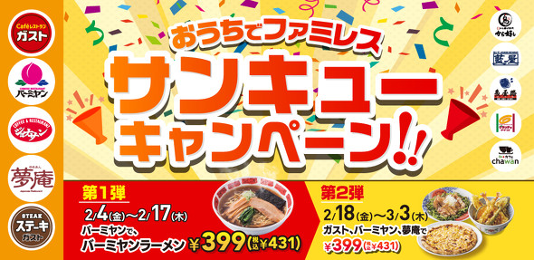 すかいらーくレストランツは、テイクアウトがお得になる「サンキューキャンペーン第1弾」を開始しました。今回はガスト・バーミヤン・ジョナサン・夢庵・ステーキガストの5ブランドが対象です。早速キャンペーンの詳細を紹介します。