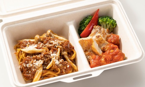 パスタとチキントマトソースがセットになったお弁当。ランチにもぴったりなメニューです。通常価格917円のところ、863円となります。