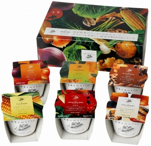 野菜をMOTTOの「野菜スープセット」は、レンジで1分温めるだけで食べられるレトルトタイプのカップスープ。カロリーはいずれも166kcal(キロカロリー)以下と控えめですが、食べ応えのあるゴロゴロした野菜で腹持ちがよいのが魅力です。また、保存料、化学調味料、合成着色料無添加、野菜は100%国産のものを使用しているこだわりの商品でもあります。