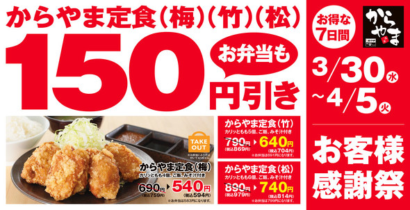 唐揚げ専門店「からやま」(運営:エバーアクション)は、3月30日〜4月5日の7日間、「お客様感謝祭」を開催します。期間中、定番の「からやま定食」が150円引きのお得な価格で楽しめます。
