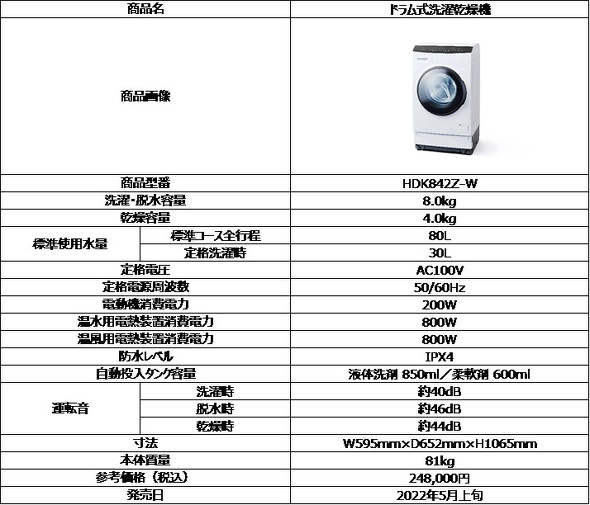 洗濯・脱水容量8.0kgのドラム式洗濯乾燥機。洗濯容量8.0kg以下のドラム式洗濯乾燥機としては初めてという洗剤の自動投入機能を搭載しています。