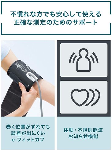 そこで便利なのが、「姿勢チェック機能」です。測定中に体が動いたり、カフが緩んでいたりすることを、アイコンなどで分かりやすく知らせてくれます。腕の角度が適切なのか、マークが点灯して細かくガイドしてくれる機能もあります。