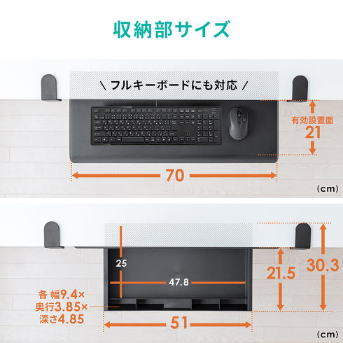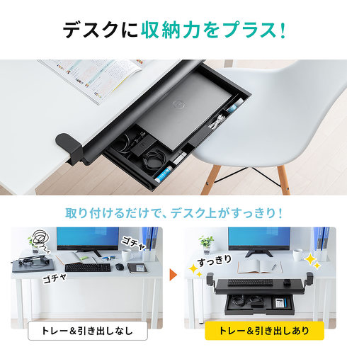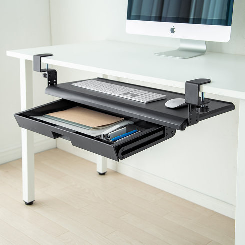 「100-KB010」は、デスクにキーボードの置き場所と書類や文房具の収納スペースを追加できる、引き出し付きキーボードスライダー。厚み1.4〜4cmの天板に対応しています。棚部分には、フルキーボードとマウスを置くことができます。