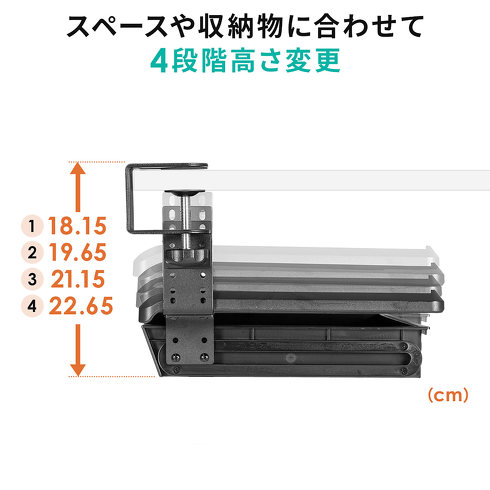 スペースや収納物に合わせて天板下からスライダーまでの距離を4段階で調整可能。キーボードを使用しない時は、棚板をスライドさせてデスクの天板下に収納できます。