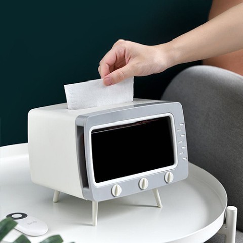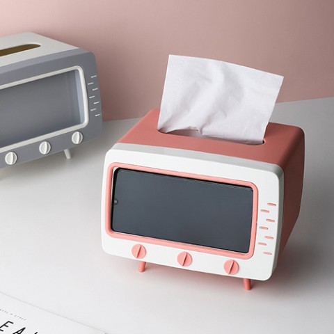 「スマホスタンド付き テレビ型ティッシュケース」は、ブラウン管テレビの形をしていて、画面のところにスマホを取り付けられる仕様になっています。スマホをセットして動画を流せば、本当にテレビを見ている気分を味わえそうです。ティッシュケースも付いているので、スマホスタンドとして使いながら、必要な時にサッとティッシュを取り出せます。