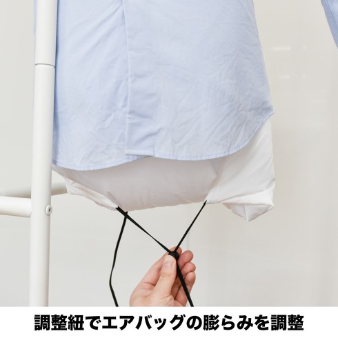 シャツ1枚の乾燥とシワ伸ばしは、約30分で完了。タイマー式で、最大180分まで設定ができます。エアバッグのファスナーと調整ひもにより、S〜LLサイズまでのシャツに対応。Yシャツだけでなく、Tシャツやポロシャツにも使用できます。