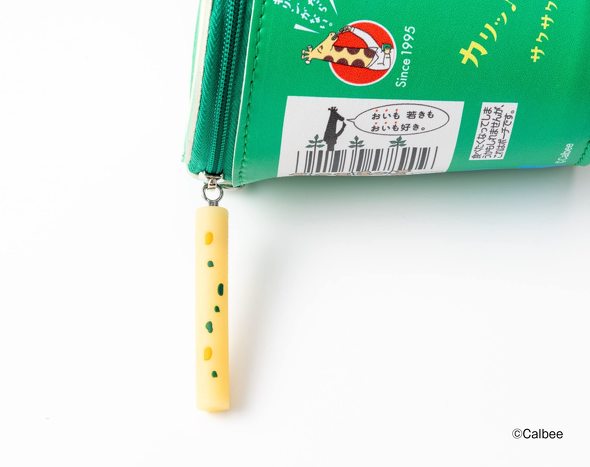 通常サイズのポーチ(サラダ味/チーズ味/たらこバター味)は、約11(高さ)×9(上部直径)×6.5(底部直径)cmで、本物の「じゃがりこ」がぴったり入るサイズ感。文房具やガジェット、コスメなど、細々としたものが収納できます。