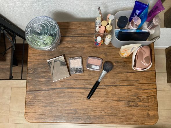 ドレッサーとして活用するため、化粧品やメイク道具を設置していきます。あまりたくさんの化粧品をテーブルに置いてしまうと、作業スペースが狭くなってしまいます。そのため、使用頻度の高いものや立てて収納したいものに限定して置いていくことにしました。