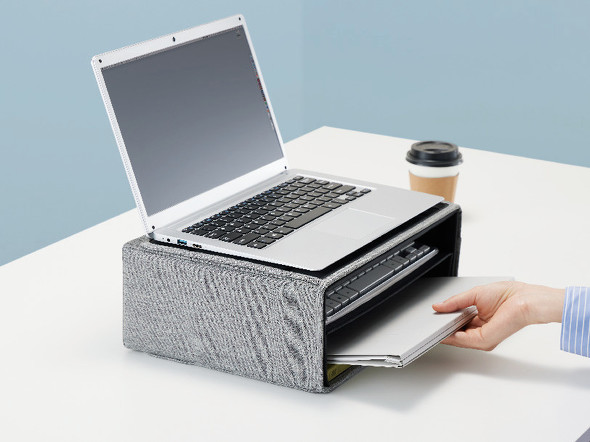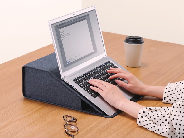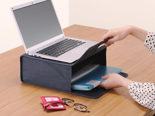 「机上台にもなるミーティングバッグ」は、取っ手を折り返すとフラットになるので、パソコンを載せてもガタつきません。目線が高くなり、姿勢改善にもつながります。