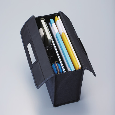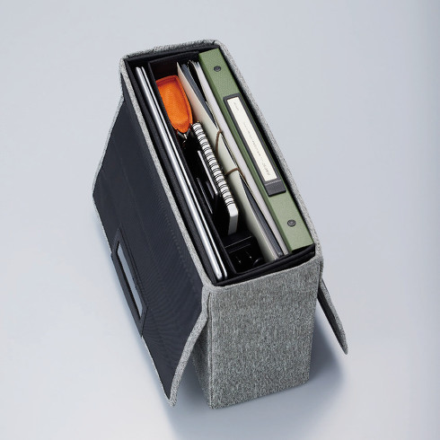 「ノートPCスタンドにもなるミーティングバッグ」と「机上台にもなるミーティングバッグ」は、作業に必要なツールをまとめて持ち運べるバッグとしても、ノートパソコンスタンドや机上台としても活用できる新しいコンセプトの商品です。ノートパソコンを上に載せた状態で書類やファイルを出し入れすることができるため、限られた机上スペースを有効に活用できます。