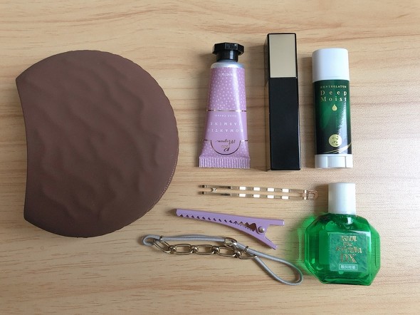 2つのポーチそれぞれに、いつものお出かけアイテムを入れてみました。パイ型のポーチには、リップクリームや目薬、小さいハンドクリームなどをイン。頻繁に使う、散らばりがちな小物も、これに収納すればかわいくすっきりまとまりますね。