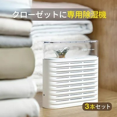 薄型タイプなので、ちょっとした隙間にもサッと設置可能です。除湿面積は約3畳。除湿量は約50mlなので、引き出しや収納棚など、狭い場所で使うのがおすすめです。サイズは、約12(幅)×4(奥行)×12.3(高さ)cm。3本セットで販売しています。