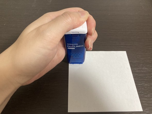 スタンプ感覚で軽く押すと、約1cmのテープのりが貼り付きます。これなら紙の角や封筒など、狭いところののり付けにとても便利。ポンと押すだけなので、小さい子供でもきれいにのり付けができそうです。