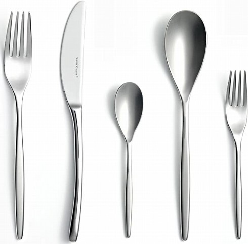 ステンレス製の本体は細身の美しいシルエットで、表面がつや消し加工になっています。セット内容は、ディナーナイフ、ディナースプーン、ディナーフォーク、ティースプーン、ケーキフォークが各1本ずつ。現代の食事で最もよく使われるカトラリーがセットになっています。