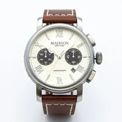 マディソンニューヨークの「MA011009-4」は、凹凸加工を施したバンプティーダイアルを採用したウォッチ。ベージュカラーのダイアルとブラウンカラーのインダイアルが大人らしさを演出します。