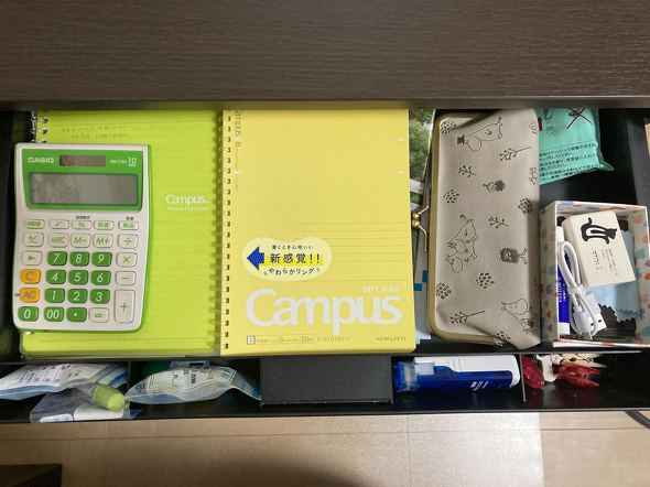 そこでデスク上を圧迫しない、サンワダイレクトの「クランプ式引き出し」を導入することに。実際に取り付けてみると、しっかりとした安定感で、ノートや小物類をしっかりと収納できました。取り付けてから数カ月経ちますが、問題なく使えています。