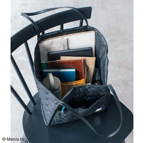 どんなコーディネートにも合わせやすいシンプルなブラックカラーのキルティング。大きな特徴は、両サイドのマチをたためばコンパクトなシルエットにできることです。