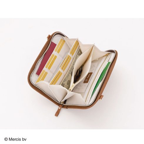 18個のカードポケット、2つのファスナーポケット、2つの隠しポケットが付いており収納力も抜群です。取り外し可能なショルダーストラップ付き。スマホと、現金やカードをさっと入れてちょっとしたお出かけができます。