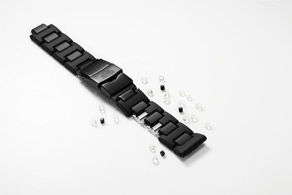 「PRW-51FC」「PRW-61FC」は、バイオマスプラスチックを使ったフィールドコンポジットバンドを初採用したモデル。メタルを埋め込んだバイオマスウレタンとバイオマスプラスチック素材のコマを使ったブレスレットになっており、割れや変色などに強い耐久性と軽さを両立しています。