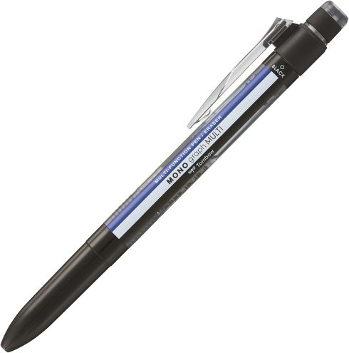 トンボ鉛筆の「2&S+消しゴム MONO モノグラフマルチ」は、黒・赤のボールペンとシャープペン、大容量のくり出し式「MONO消しゴム」を搭載した多機能ボールペン。クリップ部分を回して、出したいペンのアイコンに合わせて機能を選択できる回転式を採用しています。