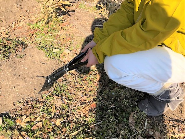 一方で、サイズが小さいので立ち仕事はしにくいかもしれません。写真は身長155cmの女性が持っているのですが、シャベルは地面に付かないので、かなりかがむことになってしまいます。身長のある人の場合、使いづらいと感じてしまいそうです。