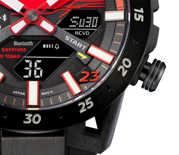 サスペンションをイメージしたデザインが特徴の「ECB-2000」をベースモデルとして、マシンを横から見た際のカラーリングのように、文字板の上半分にレッド、下半分にブラックというカラーリング。文字板の上部には「Z」の文字を散りばめたグラフィックパターンを施し、インデックスの23分の位置にエースカーナンバー「23」をあしらっています。