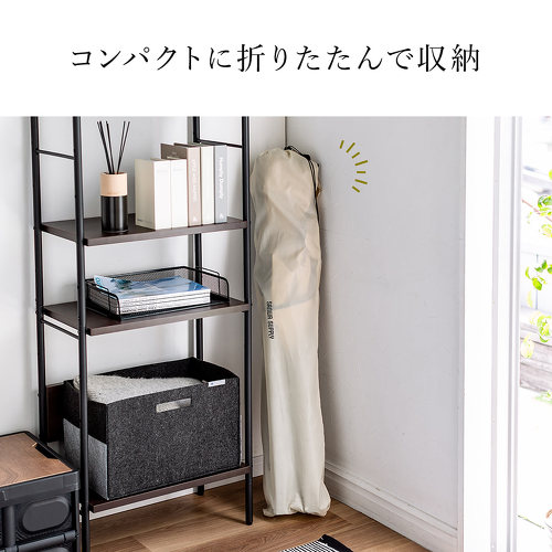さらに収納袋が付いているので、使わないときはコンパクトに折りたたんで収納しておくこともできます。肩掛けも可能なので、アウトドアシーンに持っていくことも可能です。