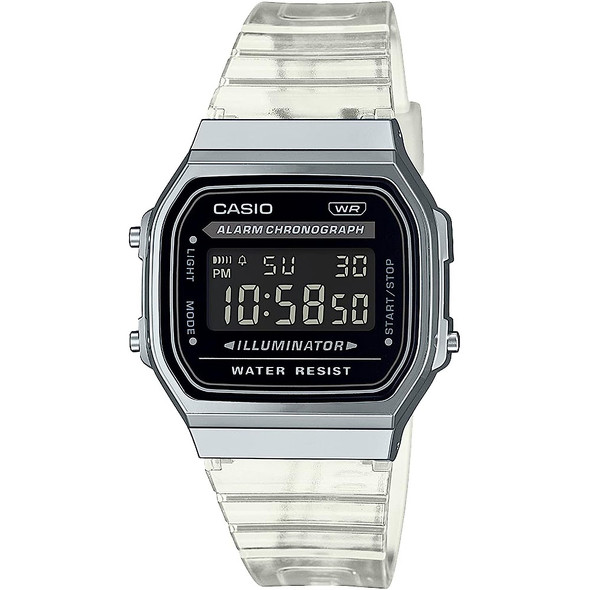 ロングセラーのデジタルモデル「A168」にスケルトン樹脂バンドをセットしたモデル。反転液晶の採用で文字板をブラックで統一し、カジュアルな中にもシックな印象に仕上げられています。
