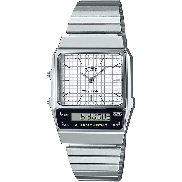 デュアルタイム表示など、アナログと液晶のコンビネーションによる実用性も見逃せません。ホワイト文字板の「AQ-800E-7AJF」のほか、ブラックの「AQ-800E-1AJF」、全体がゴールドカラーの「AQ-800EG-9AJF」をラインアップしています。