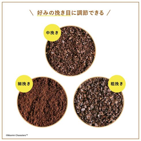 「MOOMIN 木のぬくもり コーヒーミル BOOK」のコーヒーミルは、ひき目を3種類から選べます。苦味が引き立つ細びき、苦味と酸味のバランスが良い中びき、そして酸味を前面に出す粗びきに調整が可能です。