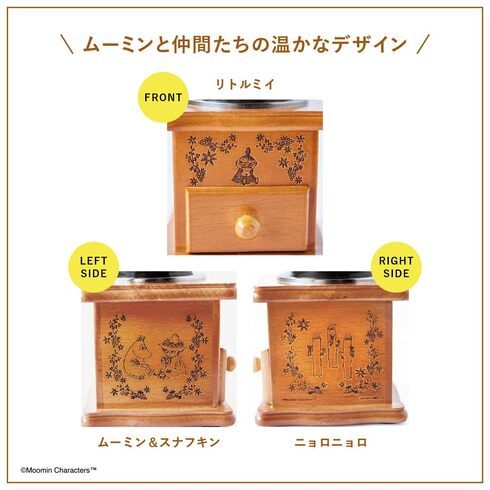 「MOOMIN 木のぬくもり コーヒーミル BOOK」のコーヒーミルは、木目にムーミンや仲間達の姿が刻印された、温かみのある手びきのコーヒーミルです。