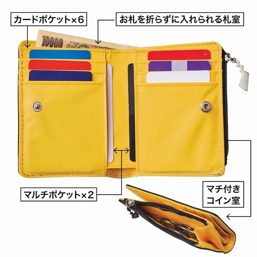 サイズは約11.5(幅)×9(高さ)cmと、小さめバッグやボトムのポケットに収納できる小さめサイズ。それでいて、内装にはお札入れと6つのカード入れ、2つのマルチポケット、コイン入れを備えているので収納力があります。