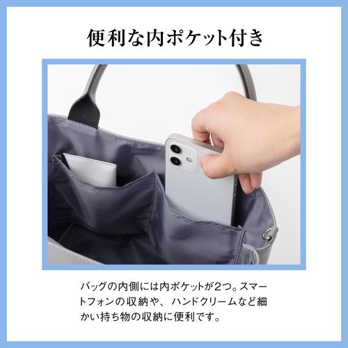 バッグの内側にはポケットが2つ付いているので、スマートフォンやハンドクリームなどの小物を分けて収納できます。